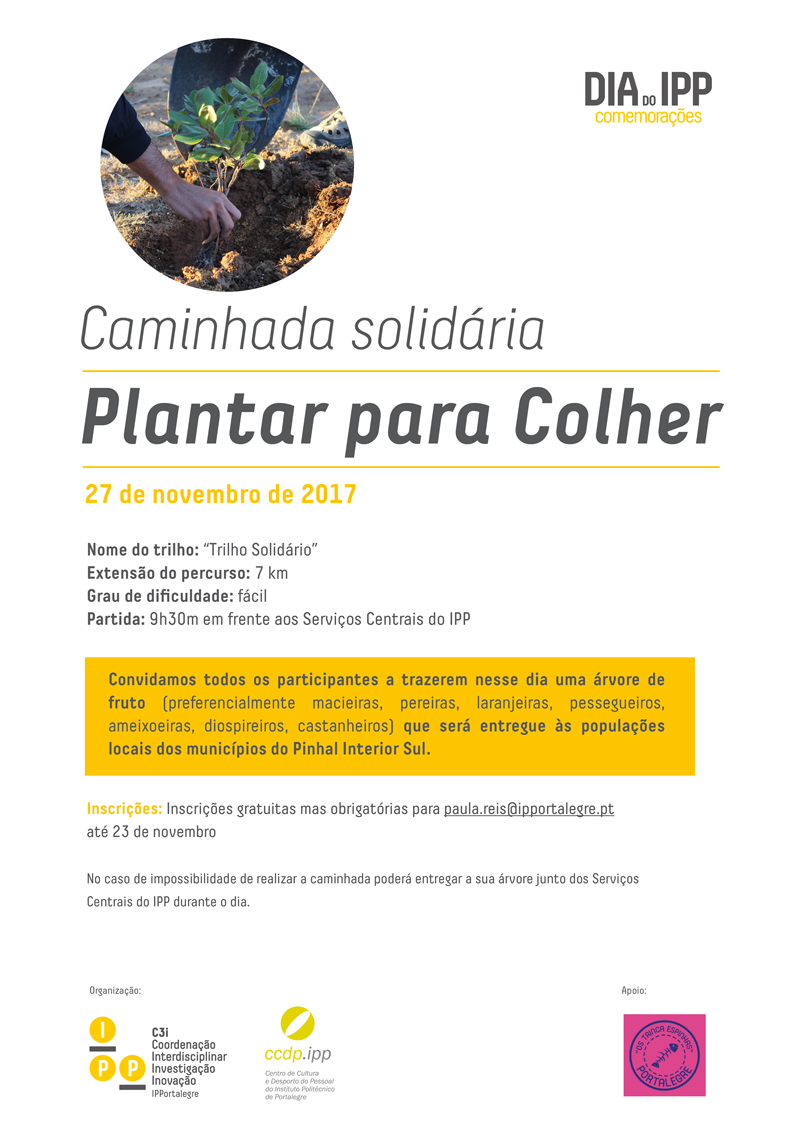A C3i, em conjunto com o Centro de Cultura e Desporto do Pessoal do Instituto Politécnico de Portalegre (CCDP), organizou uma caminhada solidária intitulada “Plantar para Colher”, dinamizada por Paula Reis, técnica da C3i, cujo objetivo passa pela doação de árvores de fruto.