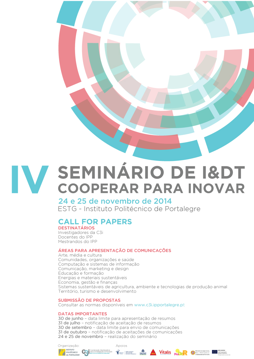 “Cooperar para inovar” é o tema para o IV Seminário de I&DT, organizado pela Coordenação Interdisciplinar para a Investigação e Inovação do Instituto Politécnico de Portalegre, que terá lugar nos dias 24 e 25 de novembro, na Escola Superior de Tecnologia e Gestão do Instituto Politécnico de Portalegre, com o objetivo de estimular a reflexão e a partilha de trabalhos de investigação científica.