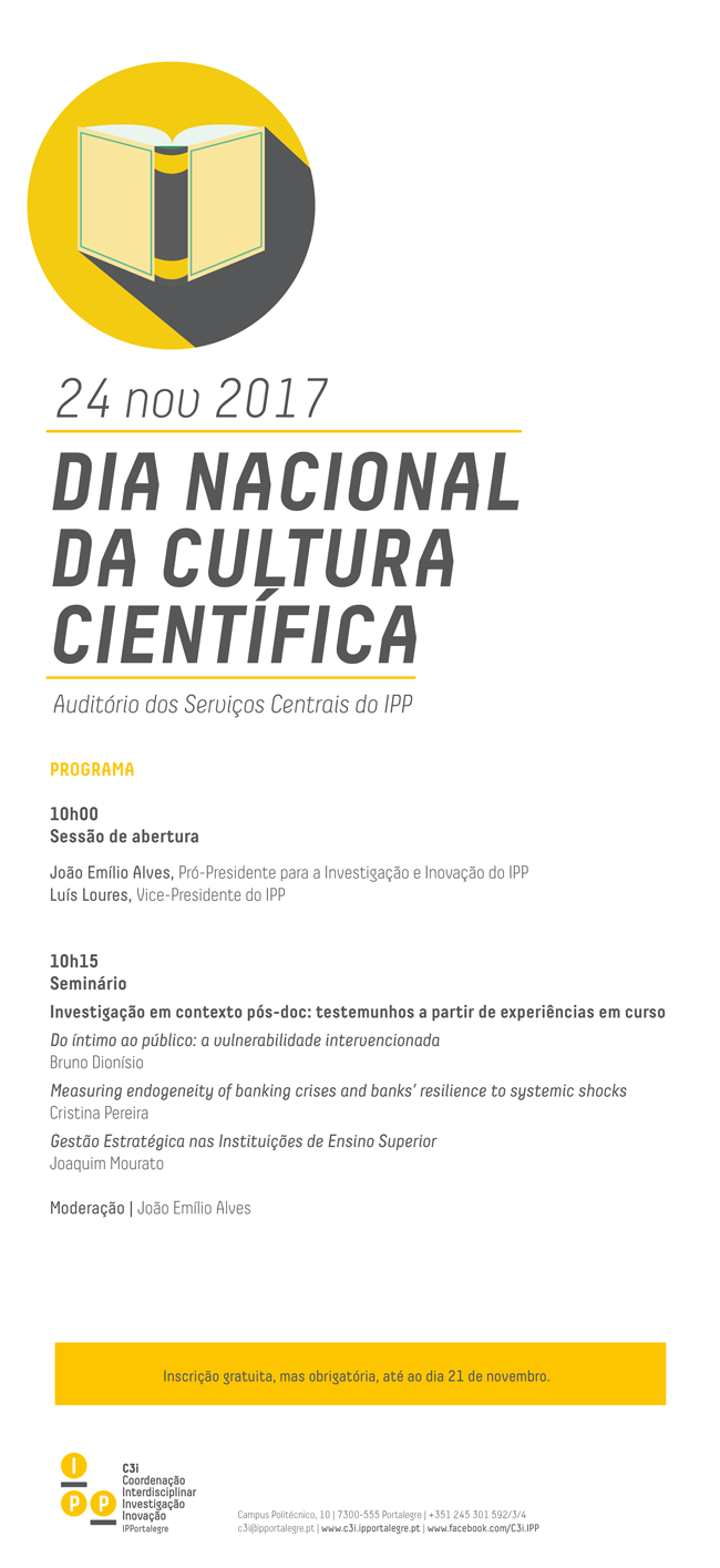 Dia Nacional da Cultura Científica | 24 de novembro Seminário Investigação em contexto pós-doc: testemunhos a partir de experiências em curso Decorreu no dia 24 de novembro, no auditório dos Serviços Centrais do IPPortalegre, o seminário Investigação em contexto pós-doc: testemunhos a partir de experiências em curso.