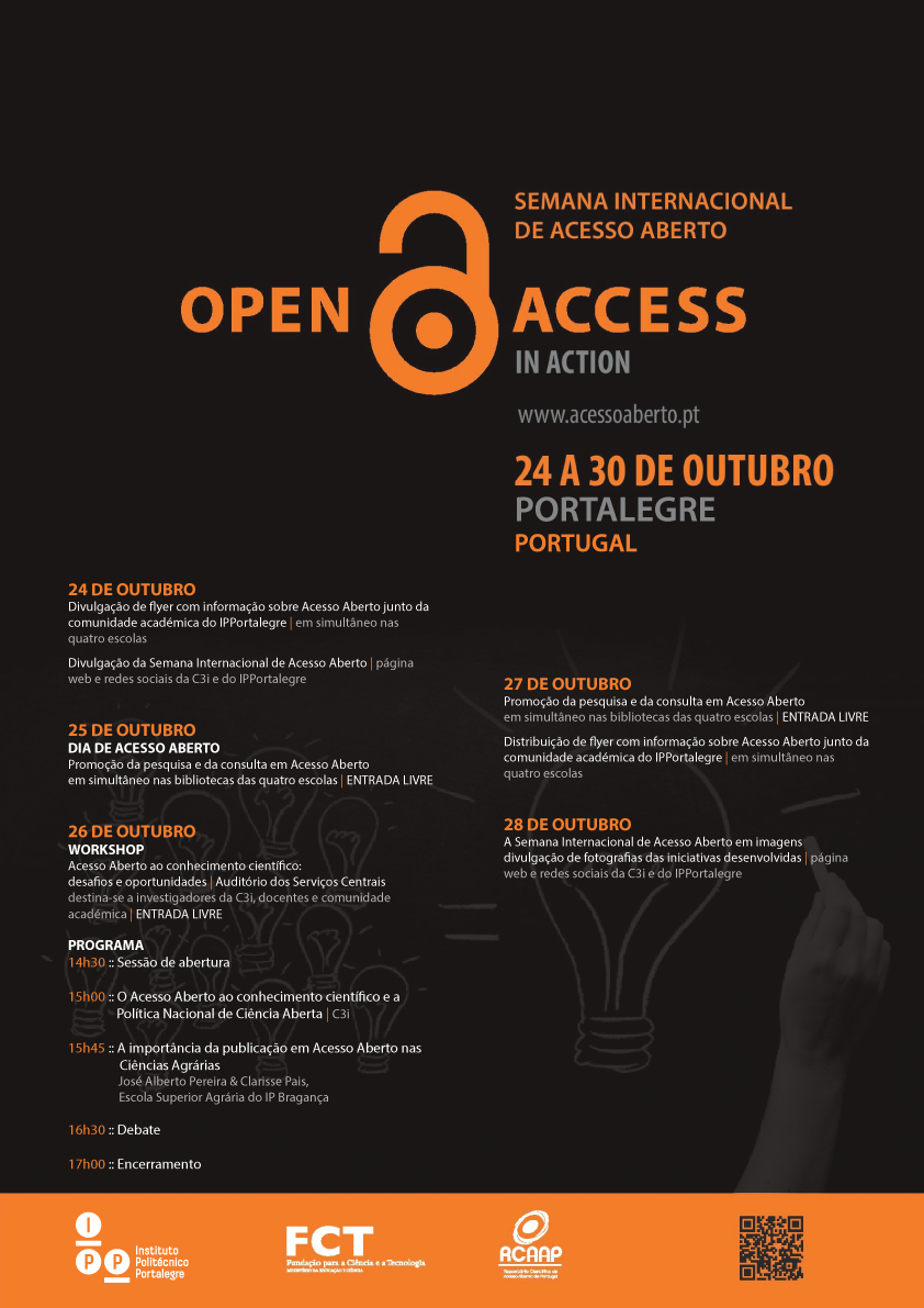 Semana Internacional de Acesso Aberto | 2016 O Instituto Politécnico de Portalegre associou-se, pelo segundo ano consecutivo, às comemorações da Semana Internacional de Acesso Aberto. As iniciativas visaram a participação de docentes, investigadores e mestrandos do IPPortalegre.